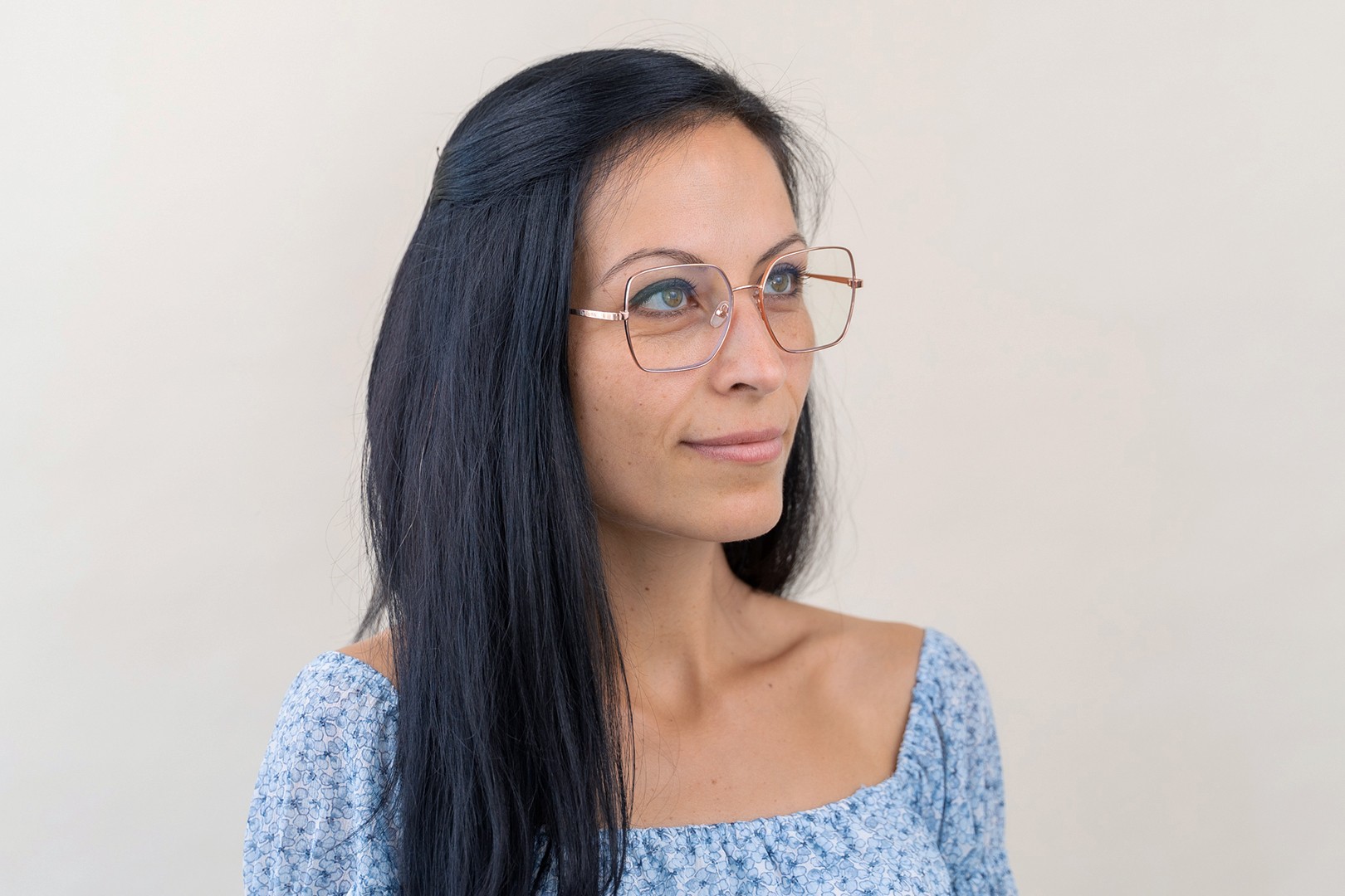 - Розовый цвет оправы идеально сочетается с холодным тоном кожи и светло-каштановыми или светло-русыми волосами.